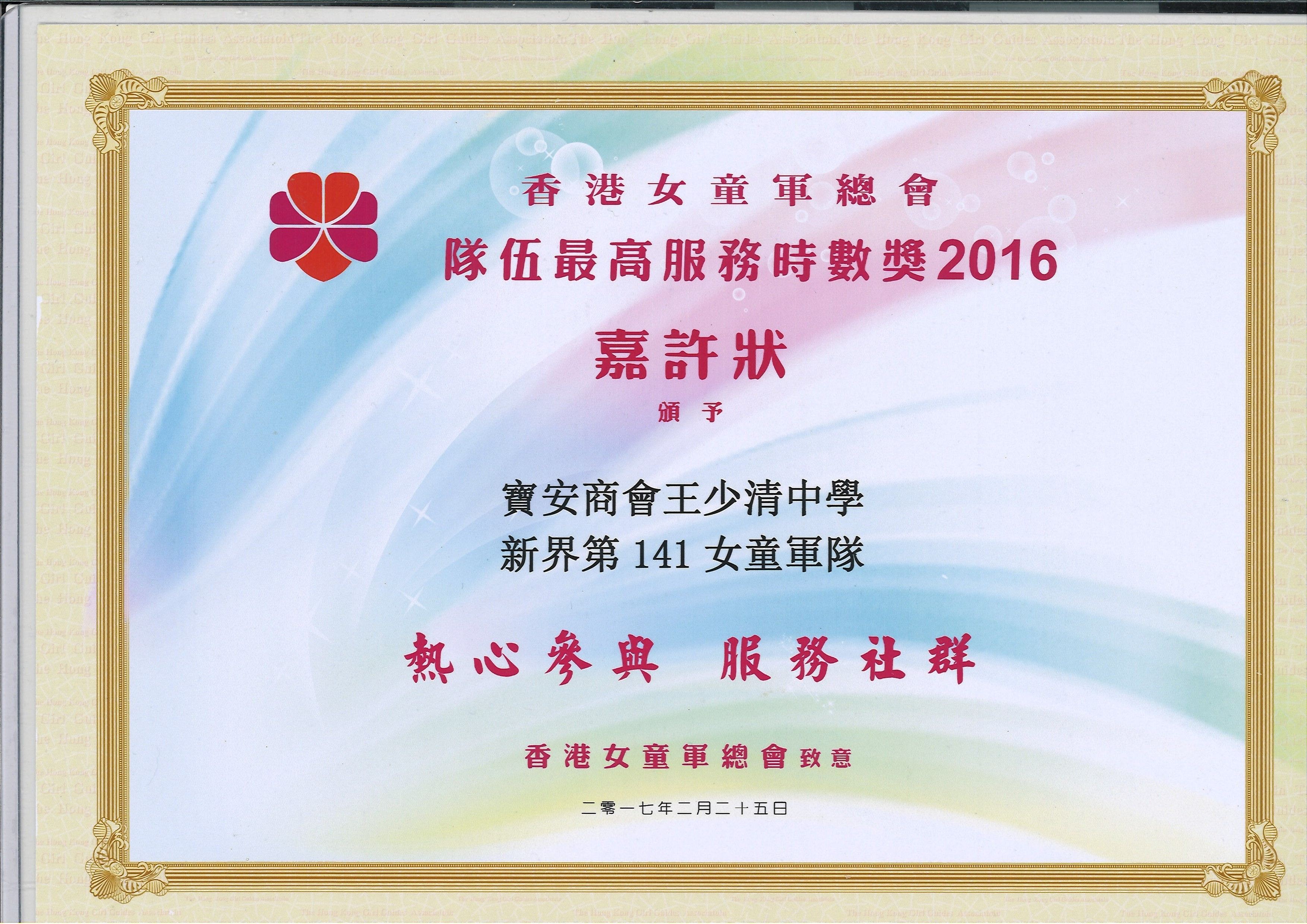 The Certificate of the Unit Highest Service Hour Award “Be the Change” is the theme of the Centenary Parade and Carnival held at the Shatin Racecourse on 25th February 2017. We echoed WAGGGA to encourage all the girls to plan the activities and serve the community and to change the world. Our school company NT 141st Coy has been awarded “Unit Highest Service hour Award” as well as “Outstanding Unit Award” on 25th February. Our Colour Party has been awarded a Ribbon and all our girls and guiders have been awarded ‘Outstanding Badge’. Once again, our girls’ distinguished performance is recognised and honourable not only by parents and teachers but also by public, professionals and specialists. Last but not least, we have been awarded this title for five consecutive years.